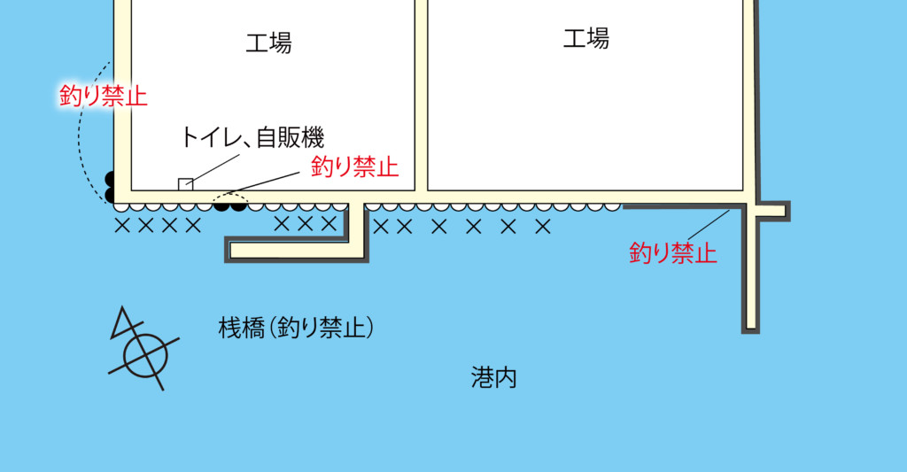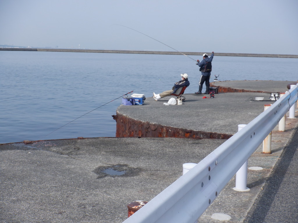 ここの1番の特長は、港内の道路が広いので、ガードレール沿いに車が駐車できること。駐車したすぐ前で釣りができる。