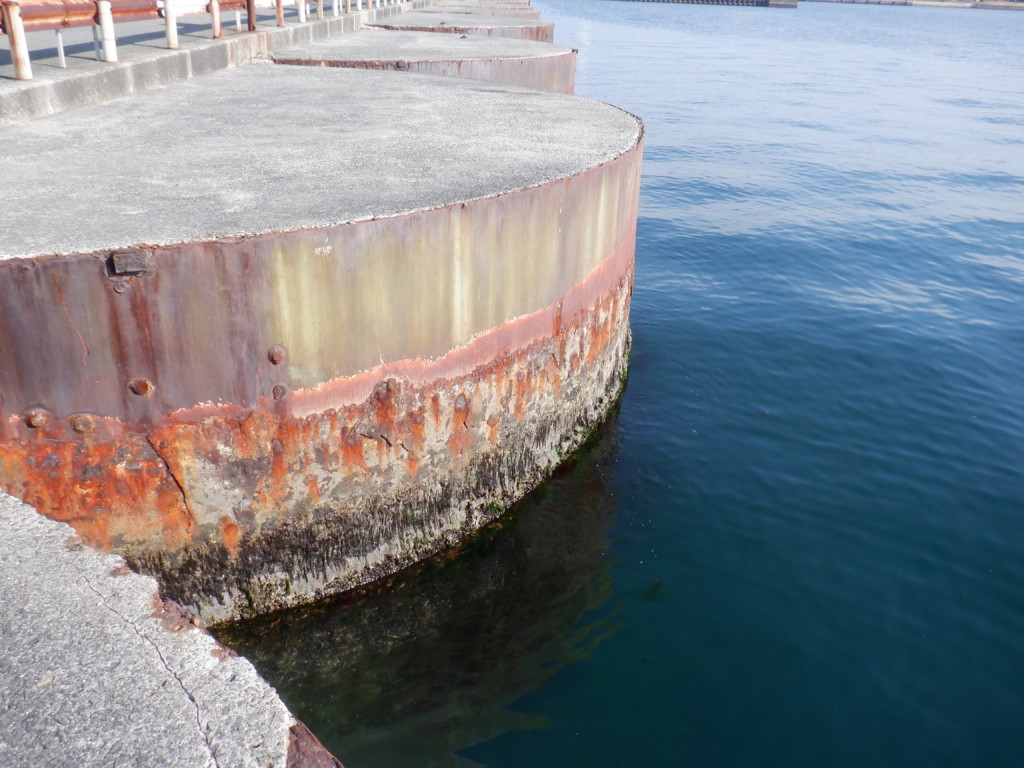 好釣り場は、港内の北側に面した通称「ドラム缶」のセル石で、食品コンビナートの北側だけでも半円状に27個も並んでいる。