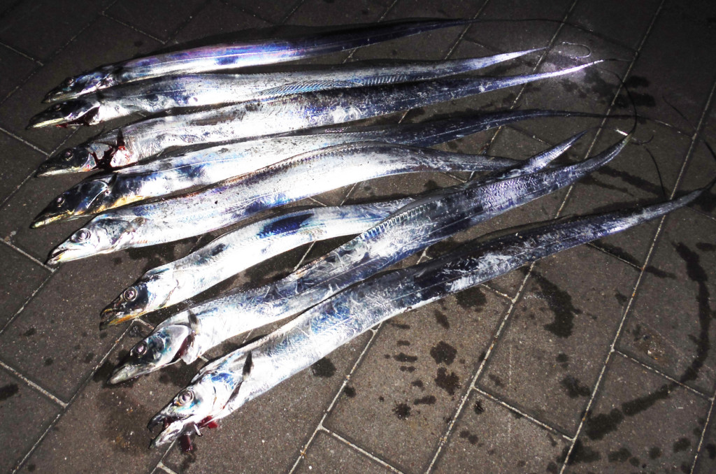 タチウオは秋が釣期で、半夜釣りが主体。電気ウキでのエサ釣り、テンヤの引き釣り、ワインド、ルアーなどで釣る。