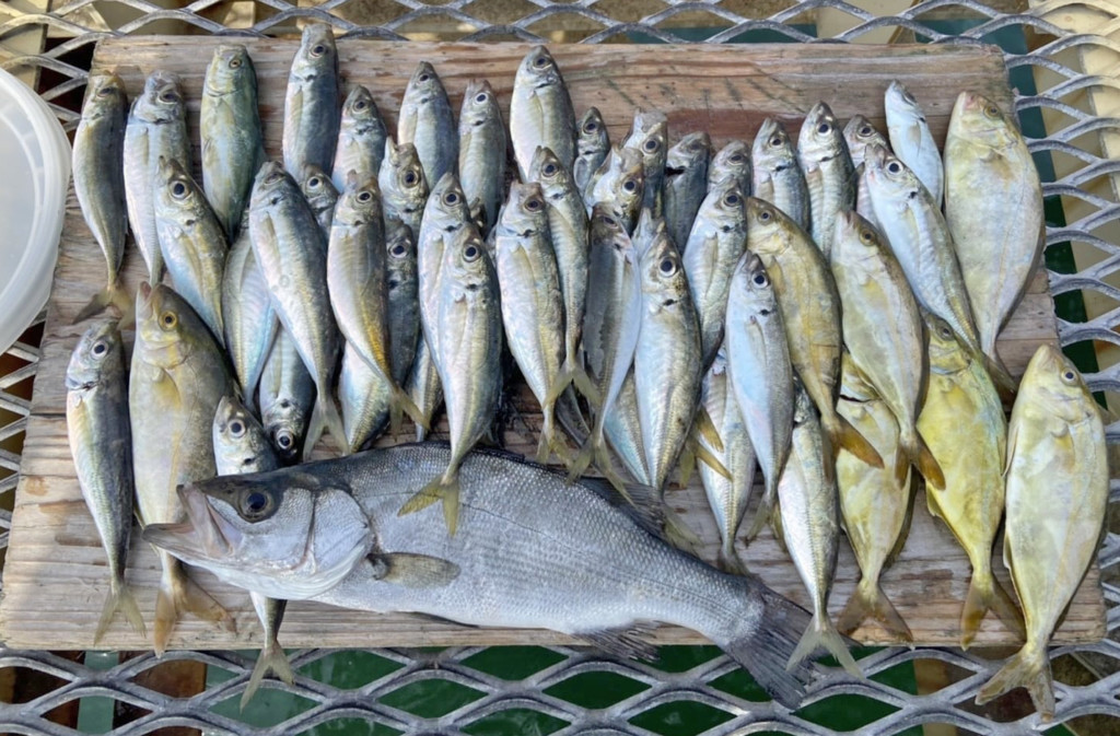 アオリイカ胴長30cm頭に2ハイ、ヒラメ39cm、アジ9cm頭に50尾、サバ15cm頭に50尾。