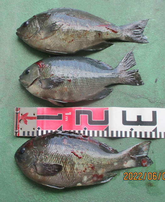 ボラ53cm、ヘダイ47cm、セイゴ45cm頭に26尾、チヌ46cm頭に3尾、メイタ35cm頭に3尾、ヒラメ38cm、バリ36cm頭に2尾、アコウ30.5cm頭に8尾、マゴチ27cm、クロ27cm頭に65尾、ネリゴ25cm頭に233尾、キス25cm頭に6尾、アジ24cm頭に3461尾、ベラ24cm頭に19尾、メバル22cm頭に7尾、マダイ22cm、ヤズ20cm頭に3尾、ヒラアジ20cm頭に2尾、アラカブ18cm頭に40尾、ヒラゴ25cm頭に94尾、サバゴ14cm頭に1950尾、トウゴロウイワシ14cm頭に1615尾。