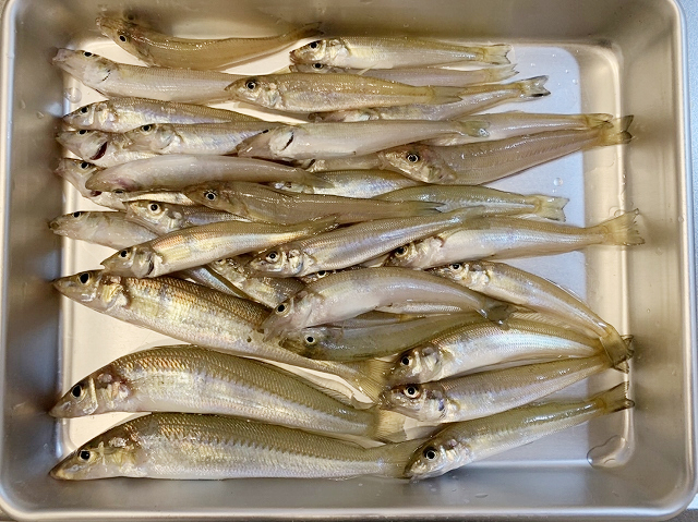 三本松港でサヨリ20cm頭に5尾、キス15cm頭に7尾。