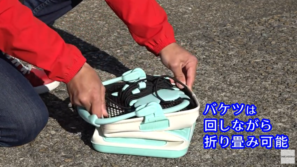 可愛いデザインはもちろん、足場の高いところからでも水を汲めるほか、釣った魚を入れておく用のスカリなど、様々な釣りに活躍する折り畳みタイプの水くみバケツです。