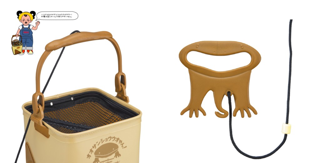 バケツの各面にはユーモラスな表情のオオサンショウウオが描かれています。そのほか、持ち手部分やロープの巻取りパーツもオオサンショウウオがデザインされています。
