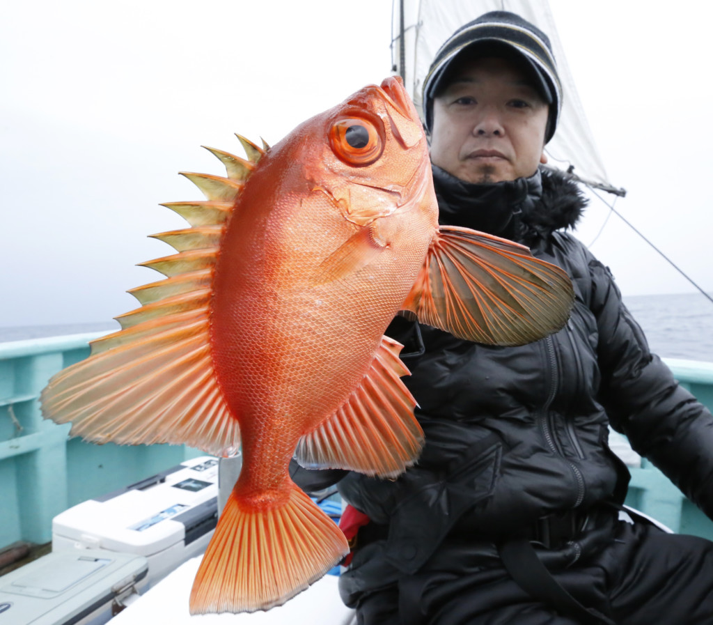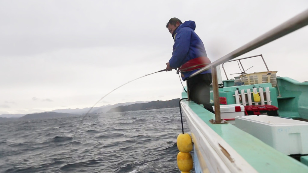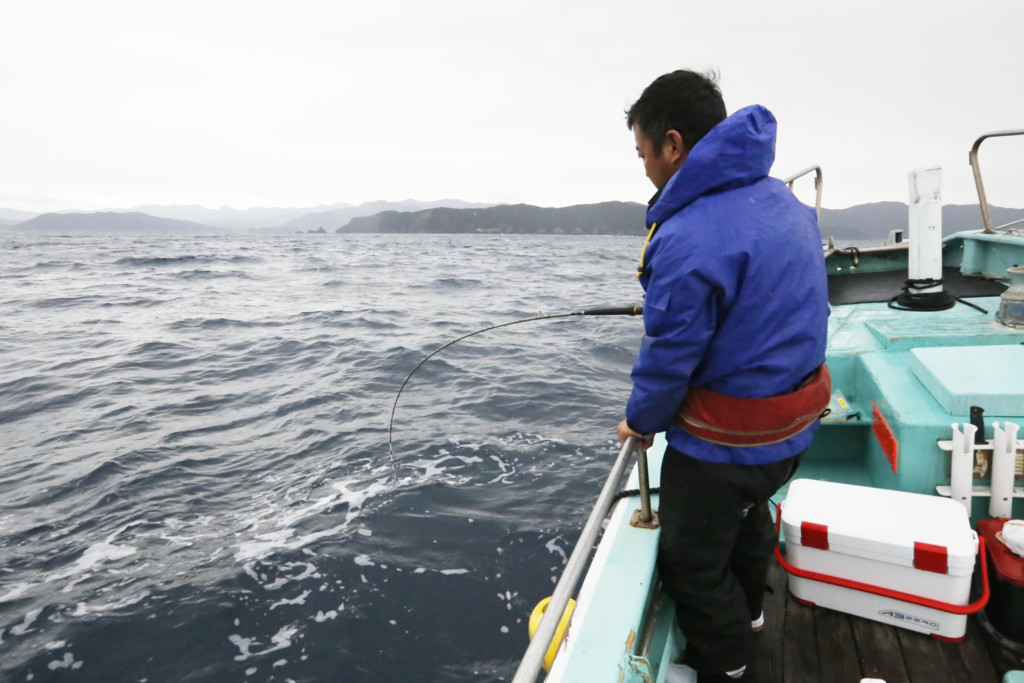 底まで仕かけを下ろして5mほど仕かけを底から上げると、ゴゴン、ゴゴンっと竿先が海面に突き刺さる。第1投目のアタリに思わず「キタ‼」と叫びました。