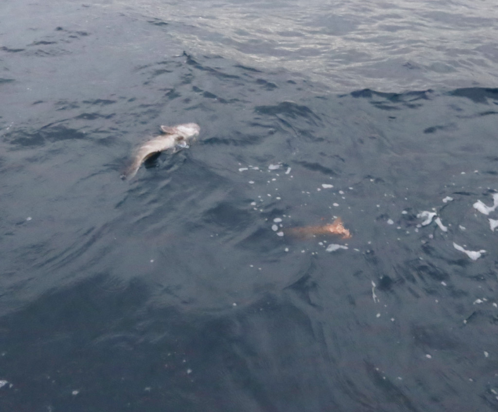 当日はノマセ釣りの仕かけの上に胴突き仕かけの要領で針を1本足して、サバの切り身をエサにした仕かけにチカメキントキが流す度に入れアタリ。