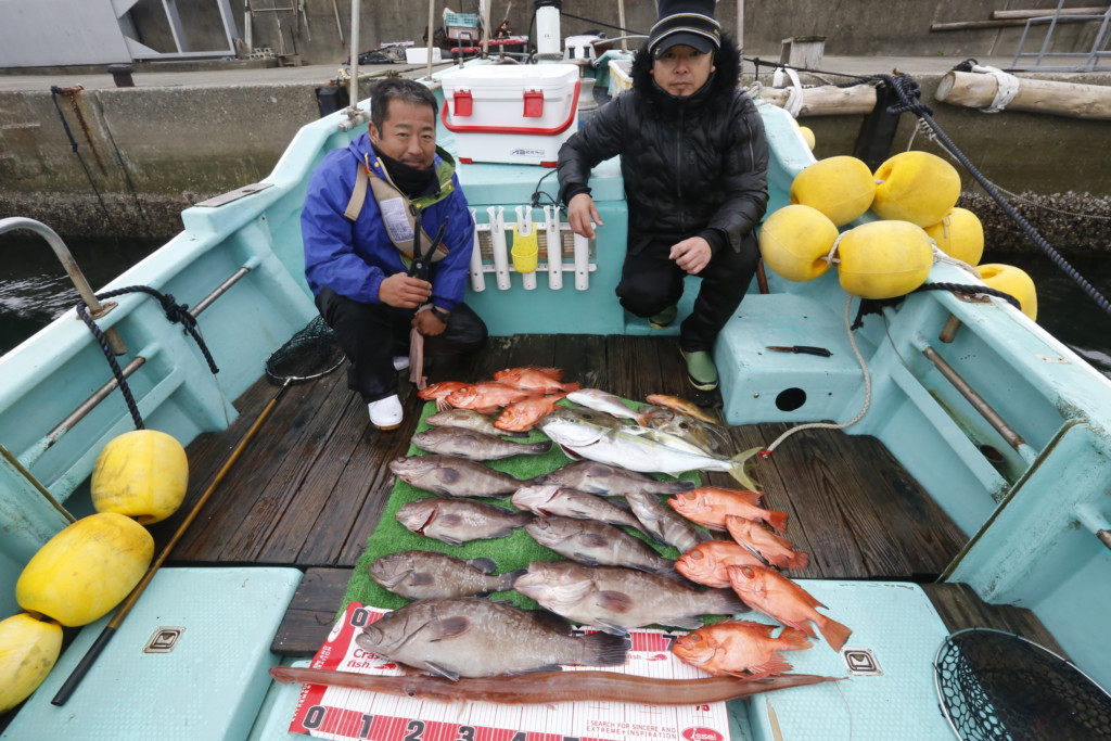 終わってみれば、2人でマハタ62cm頭に10尾とオオモンハタにアコウ、チカメキントキは9尾、ほかにもメジロやアカヤガラと土産多数の釣果大満足。