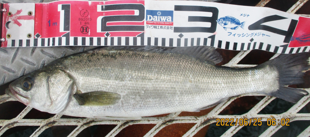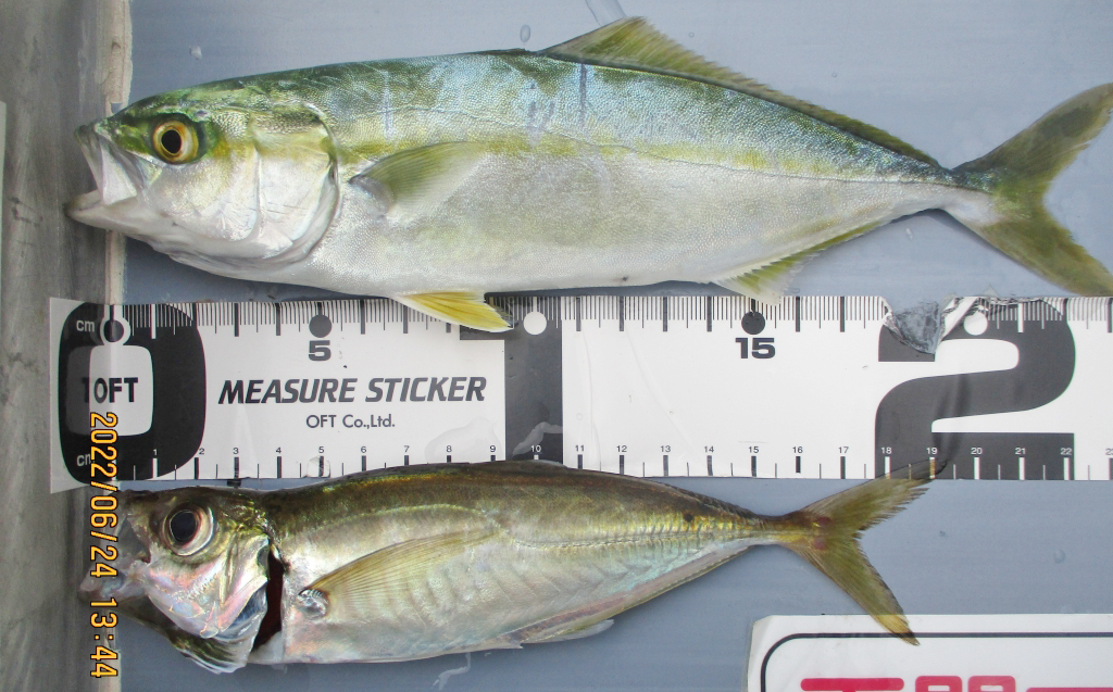 セイゴ42cm、アジ22cm頭に204尾、ヤズ32cm頭に5尾、サバ15cm頭に150尾、クロ14cm頭に2尾。