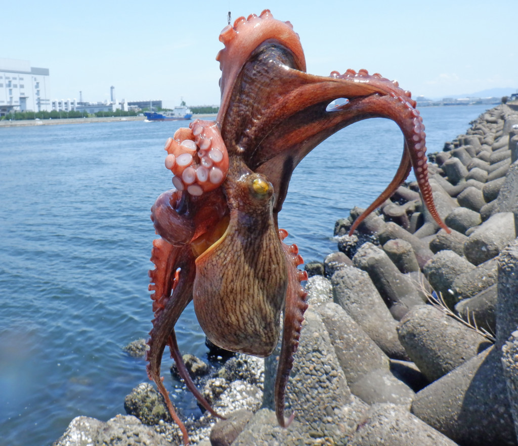 グンと重いだけで引かない。ゴミかな? と上げてくると、何とマダコ。