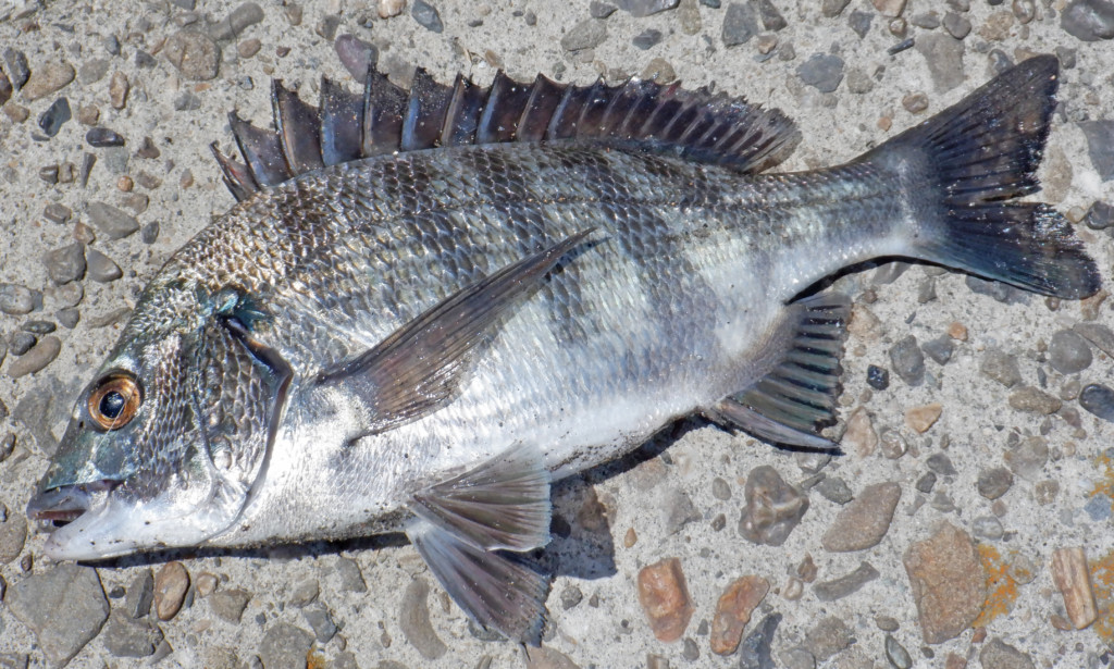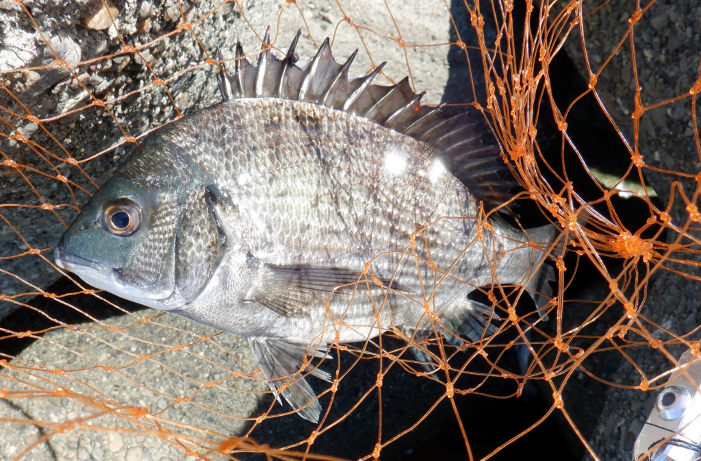 再度釣りを始めて13時半頃、2枚潮が緩んだ時、コーンエサに食い付いたのが27cmのチヌ。