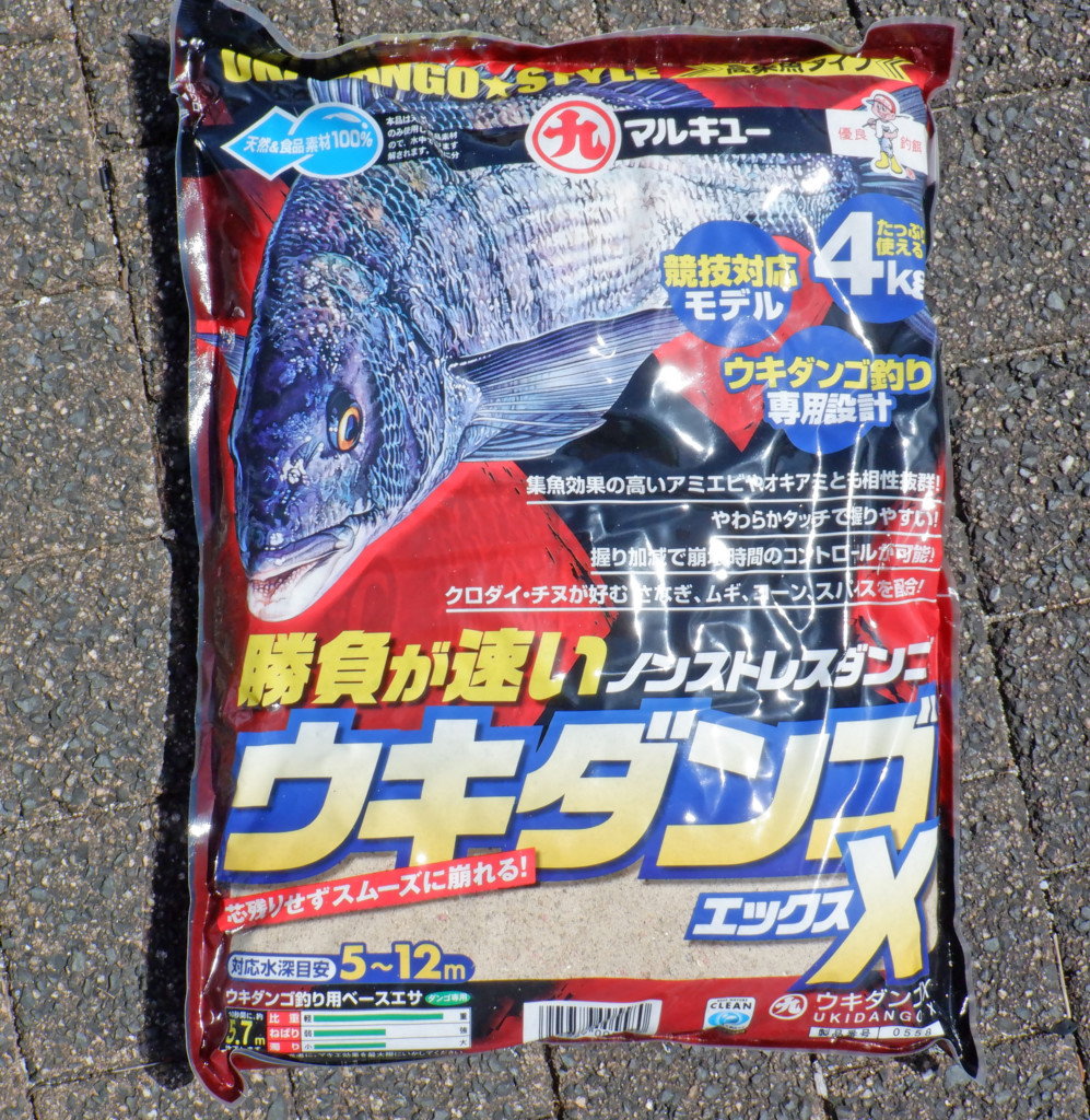 ダンゴはマルキユーのウキダンゴX1袋に、細びきさなぎを約300gとアミエビを約1kg入れ、水は少なめにして、満遍なくまぜる。サシエはオキアミと缶詰めのコーン。