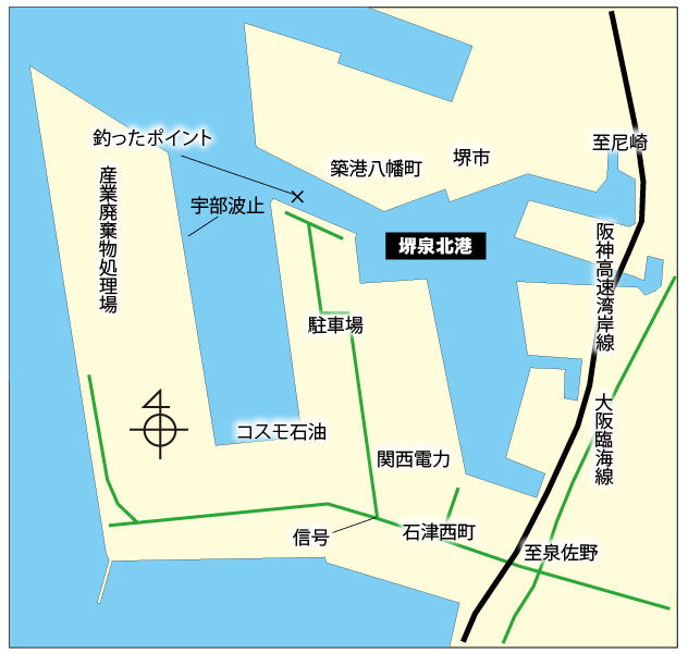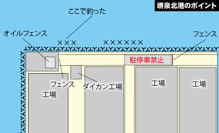 そこで潮通りがよい釣り場、潮がよく動く釣り場なら魚の活性があり、エサに食い付いてくれるだろうと思って、堺泉北港の北に面したダイカン工場前へ出掛けた。