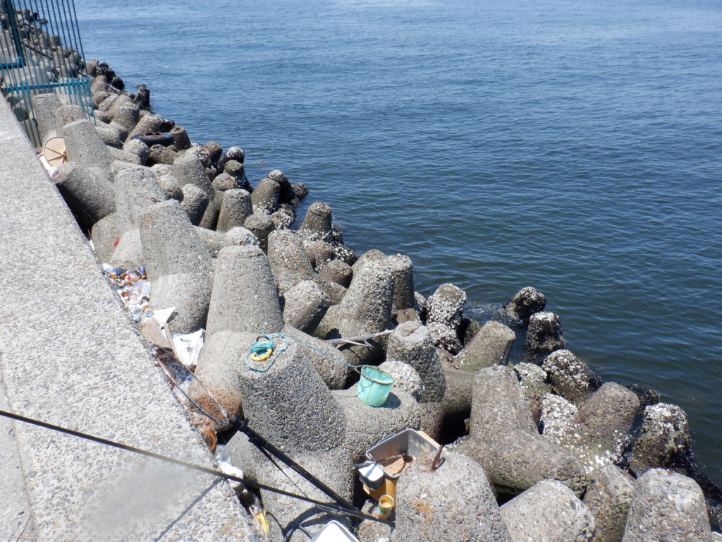 ここのテトラは小さいので、足場がよさそうな所を選べば、腰を掛けて釣れる。