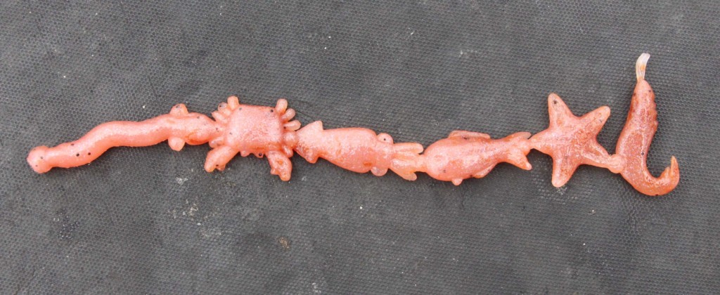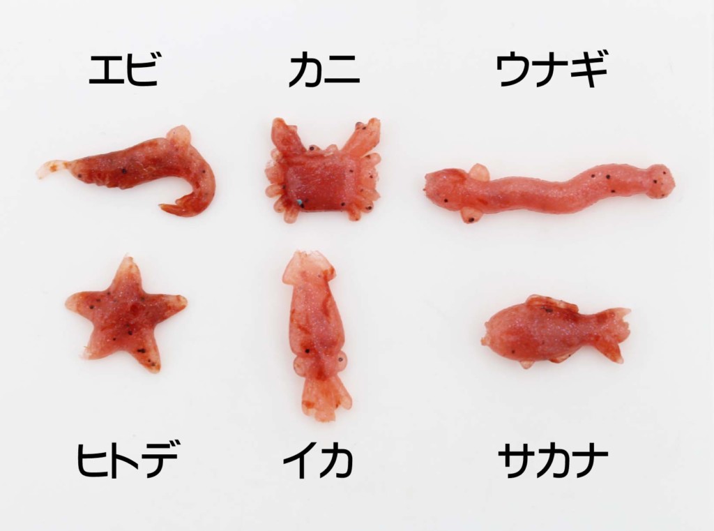 このエサは、エビ、カニ、ヒトデ、イカ、ウナギ、サカナのかわいい6形状をした人工エサです。