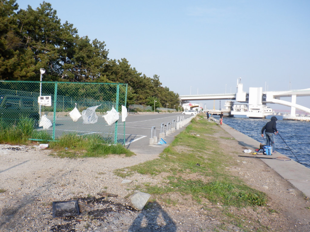 夢舞大橋下と、その左右が足場がよい釣り場。