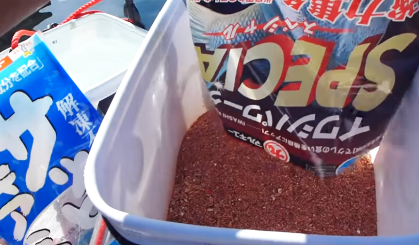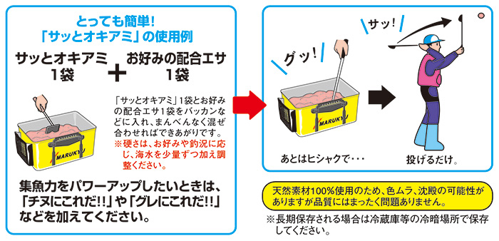 要は、「サッとオキアミ」と好みの集魚材を満遍なくまぜ合わせるだけ! とってもお手軽にマキエが作れます。