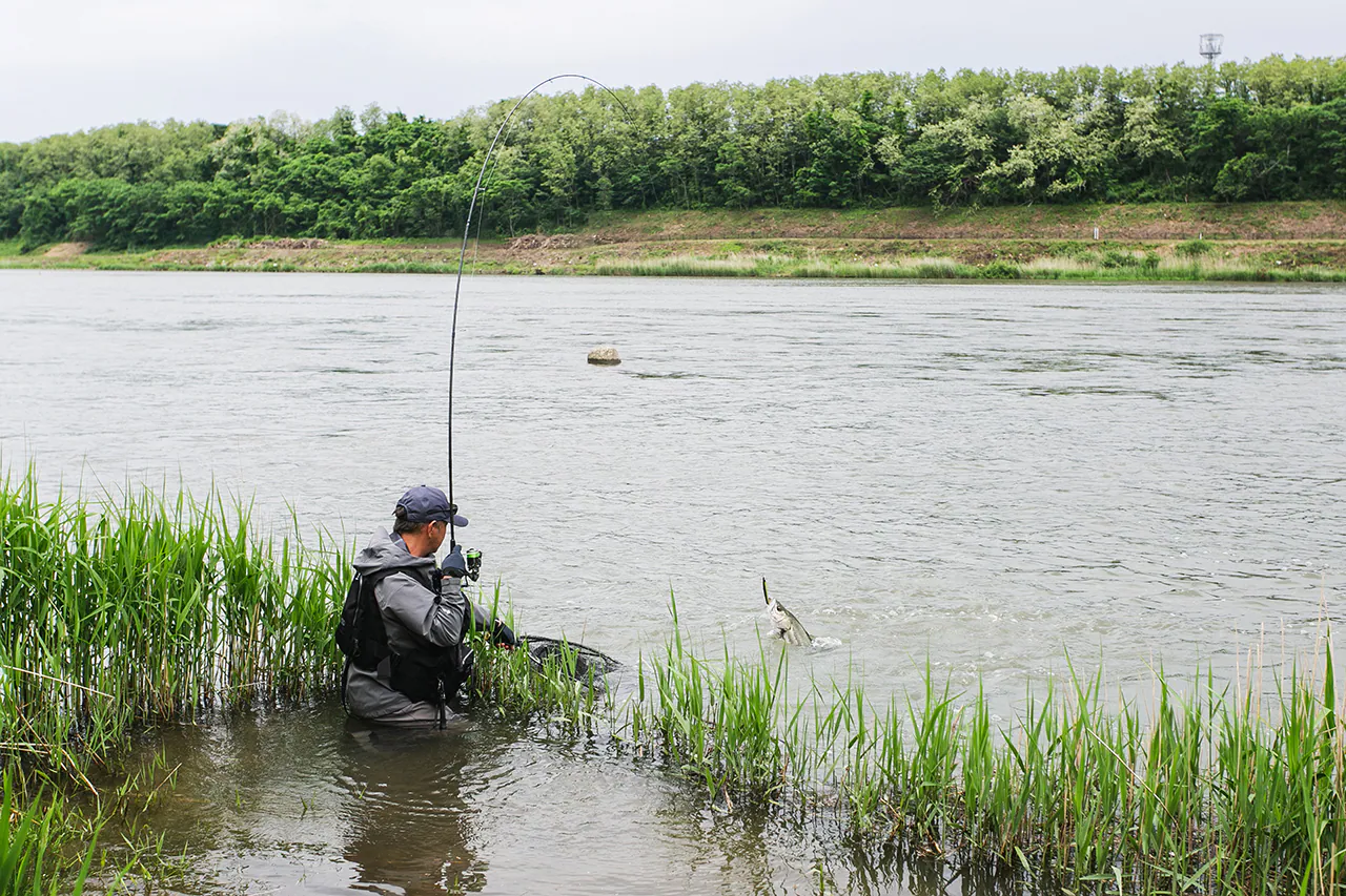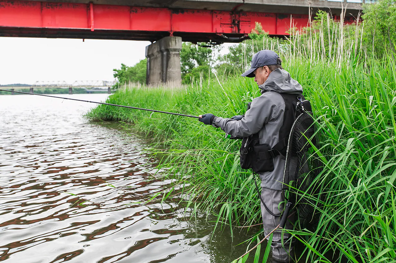 大規模河川から、小~中規模河川などのフィールドの規模もそうですが、足場のよい、悪いや、高い、低いなど、その場所に合わせたタックル選びも重要。