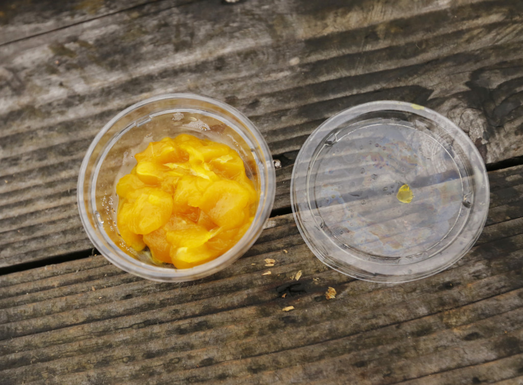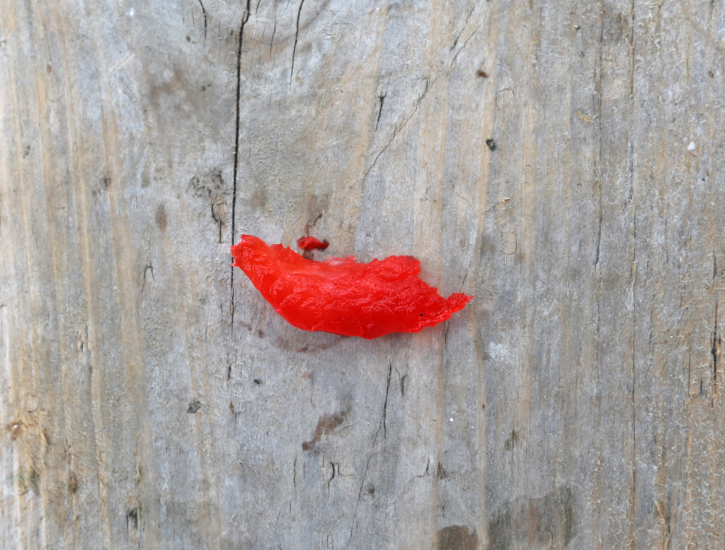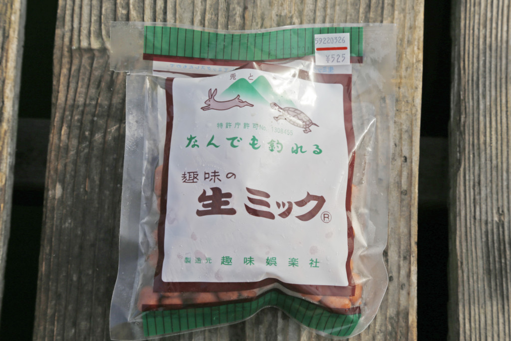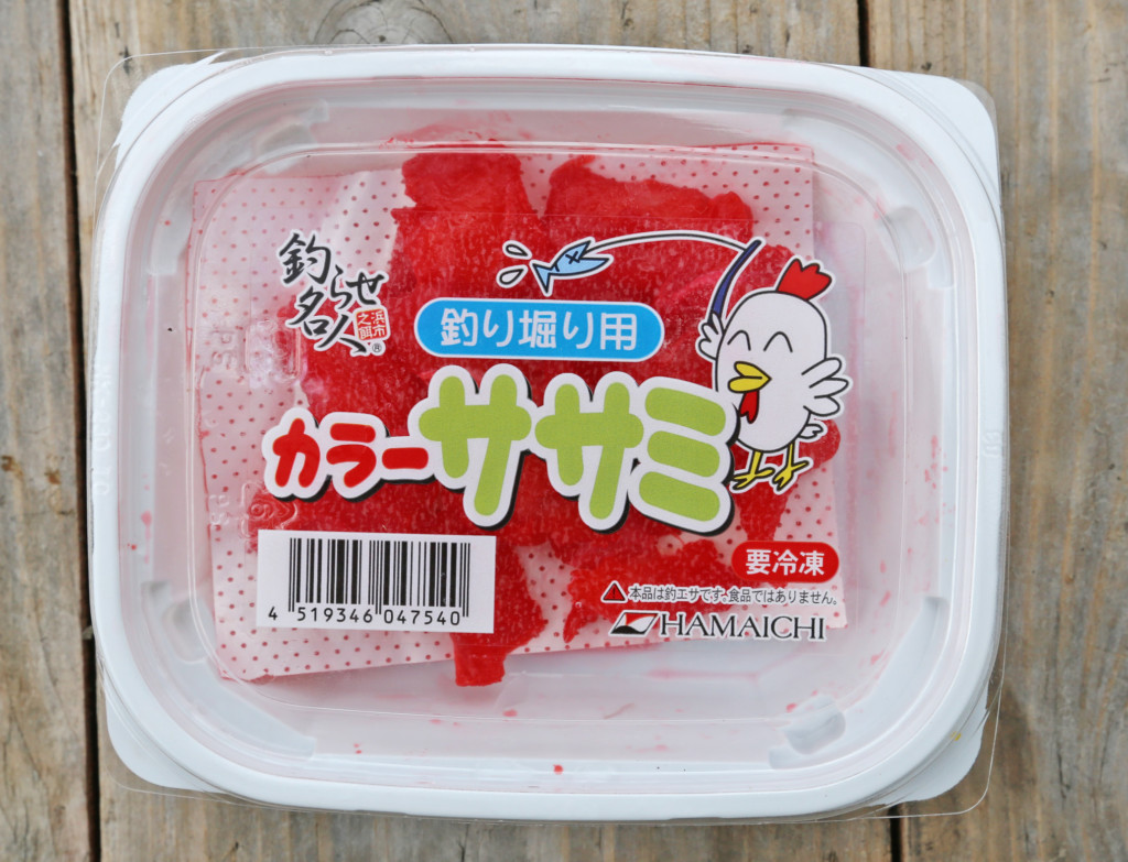 着色された鶏のササミです。ダンゴでアタリがない時に使うと食ってくることが多いです!