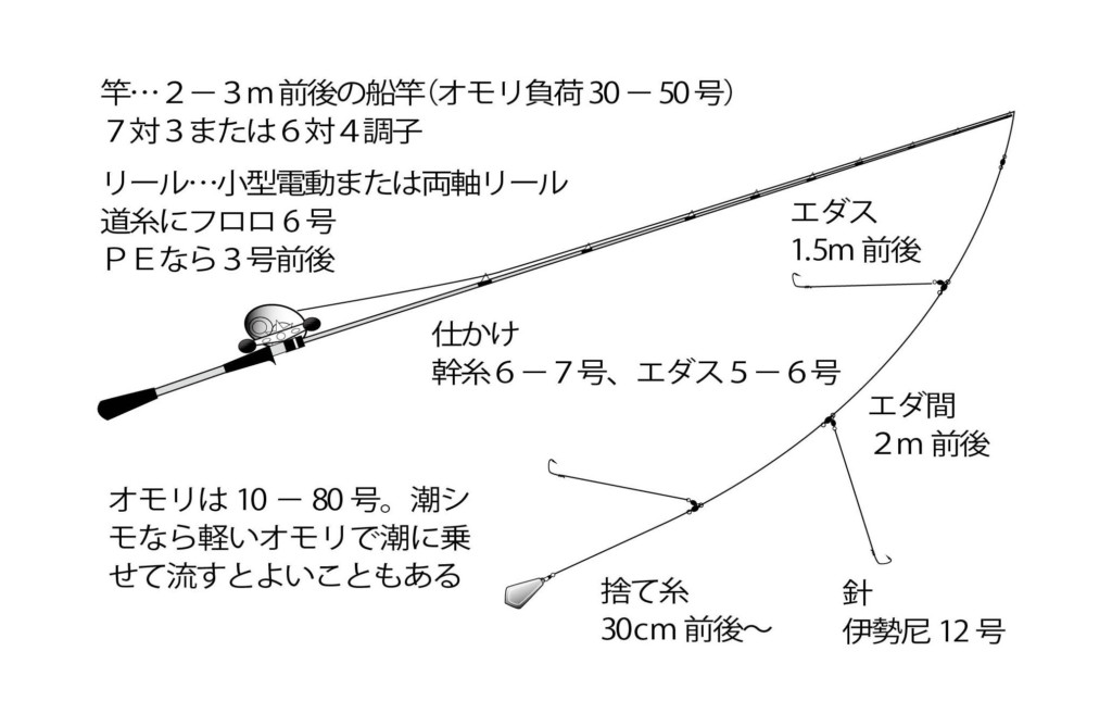 針は、伊勢尼11号や12号が一般的。幹糸はフロロ6号、エダが5号の胴突き3本針仕かけが一般的だ。