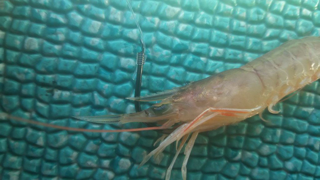 エビの脳を針で刺して絶命させないことだ。エビ頭の薄っすら黒く見える部分が脳だ。回収した時に絡まずに、エビが生きていれば、エサ付けはオーケー。