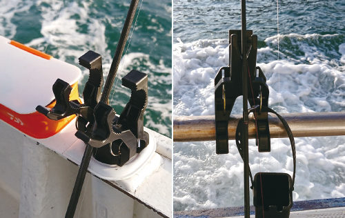 船べりやレール、お持ちのバケットマウスに装着し、簡単にロッドスタンドとして使えるようになります。