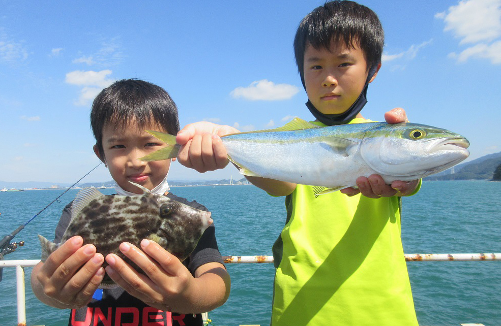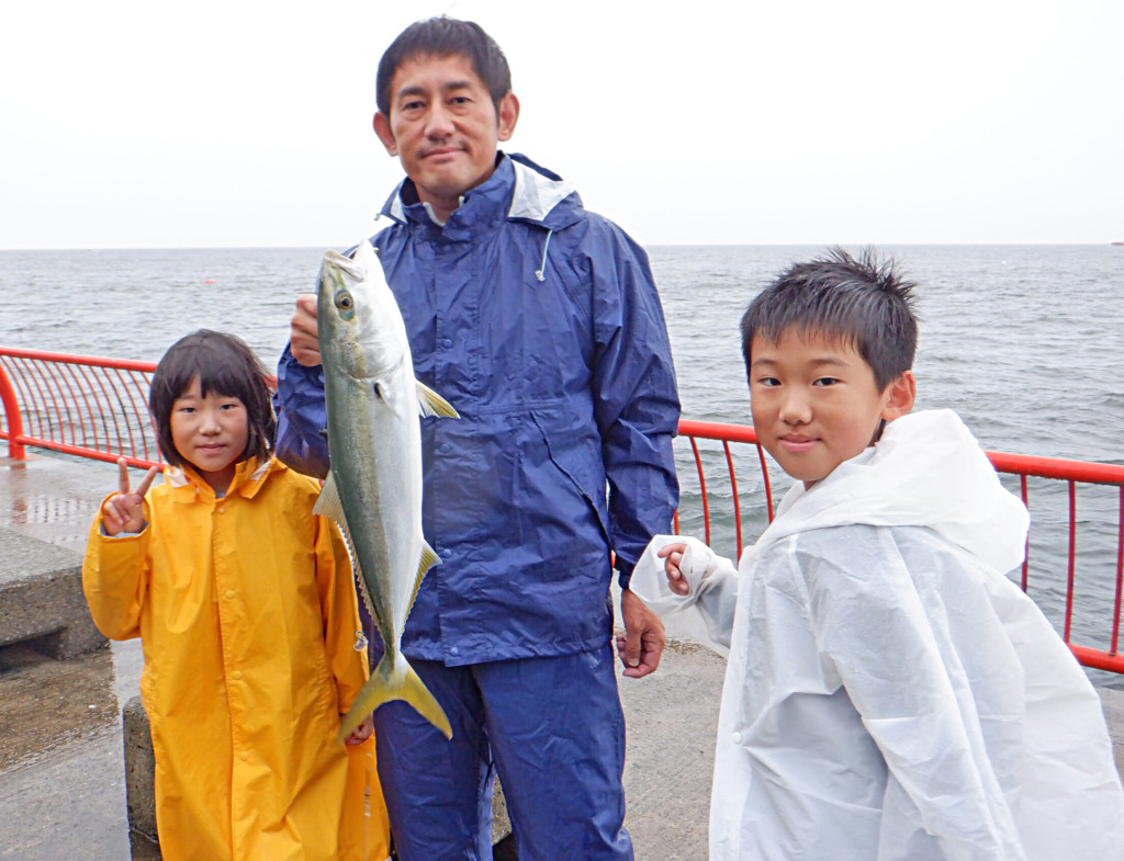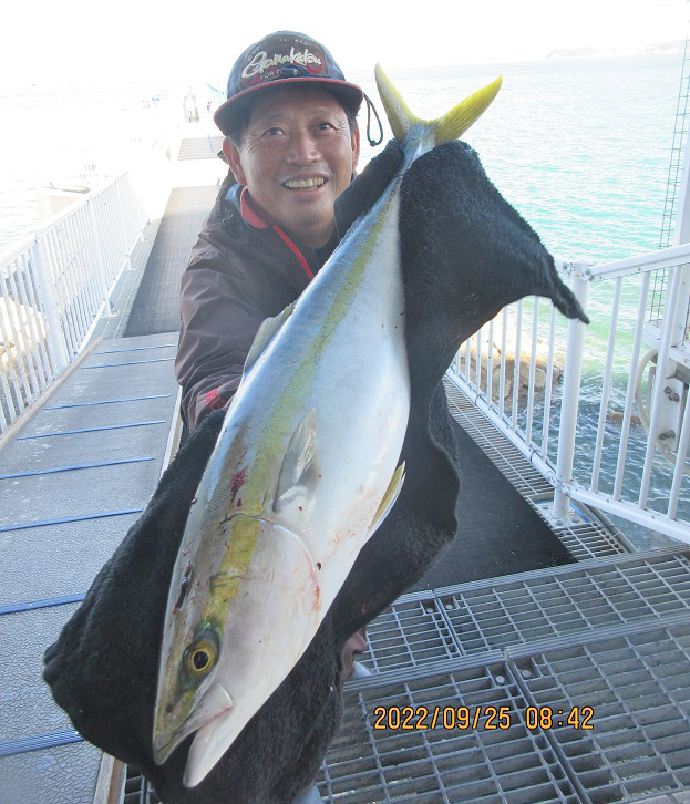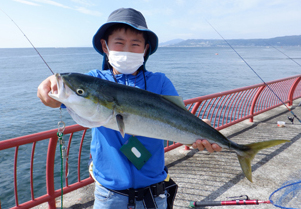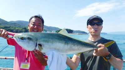 ブリ97cm、メジロ62cm、ハマチ47cm頭に多数、シオ48cm頭に多数、グレ25cm、マダイ30cm頭に2尾、カワハギ20cm頭に3尾、アオリイカ、タチウオ、アジをサビキ釣りやカゴ釣りで。