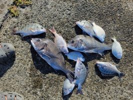 ヘダイ20cm頭に2尾、アジ25尾、グレ3尾、マダイ、コノシロ。
