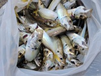 アジ13cm頭に200尾、シオ45cm頭に5尾、キビレ37cm頭に5尾、チヌ40cm。