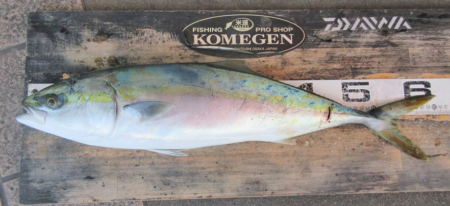 メジロ65cm頭に2尾、ハマチ46cm頭に多数、シオ49cm頭に多数、マゴチ52cm、タチウオ、アジをサビキ釣りやカゴ釣りで。