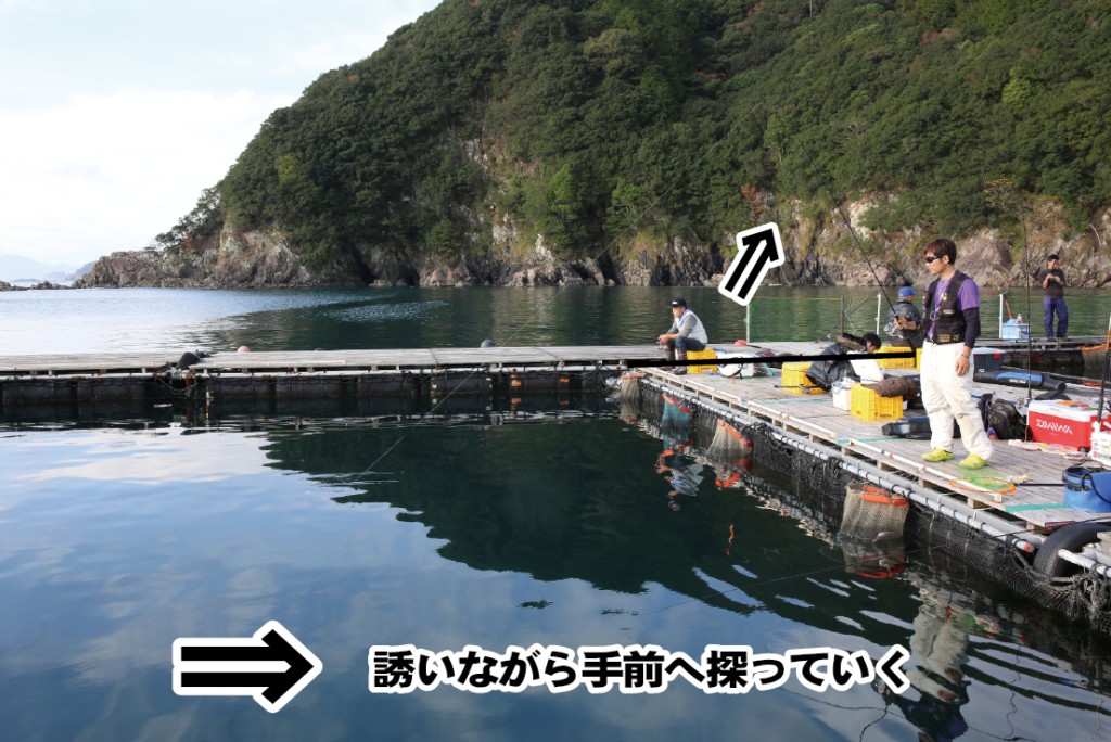 「太陽が昇ると、マダイは日陰に固まる傾向にあるので、晴れている日は沖側を選択するようにしています。また、角にマダイが固まる事もあるのですが、逆に青物が狙いにくくなるので、中央付近を選択するようにしてます」と鈴木氏。