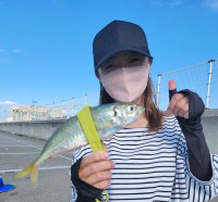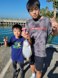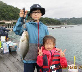 ハマチ43cm頭に、シオ37cm頭に4尾、ヒラメ43cm頭に3尾、カレイ30cm、カワハギ19cm頭に多数、グレ35cm頭に多数、メバル22cm、マダイ25cm、イシガキダイ、アオリイカ、タチウオ多数、アジをサビキ釣りとカゴ釣りで。