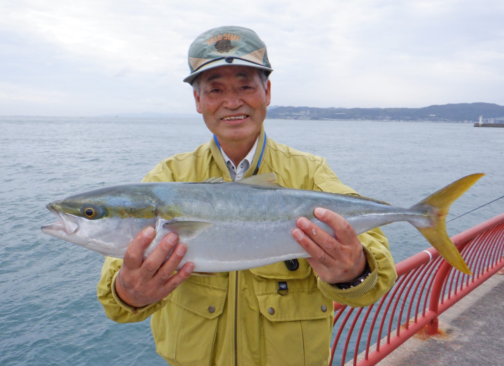ブリ84cm、メジロ62cm、ハマチ59cm頭に4尾、シオ46cm頭に2尾、マダイ36cm頭に4尾、ヒラメ55cm頭に2尾、カワハギ36cm、グレ31cm頭に5尾、ウマヅラハギ、メバル、コウイカ、アオリイカ、アジをサビキ釣りとカゴ釣りで。