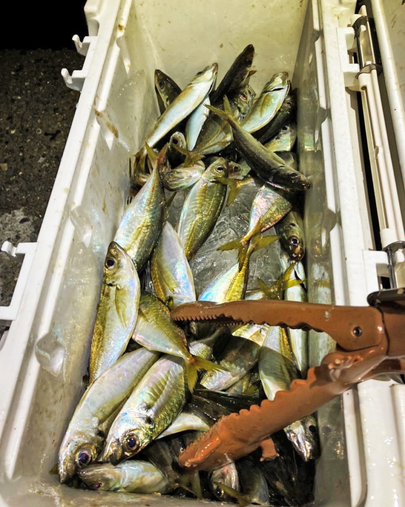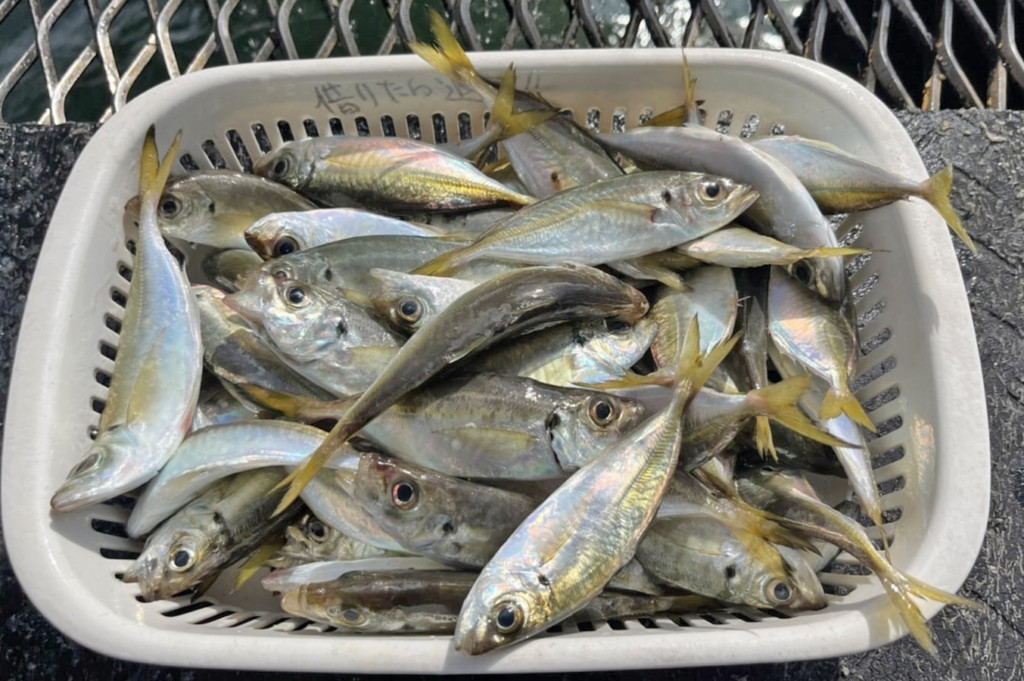 サンポートでアジ20cm頭に20尾、チヌ40cm頭に2尾、シーバス60cm頭に3尾。