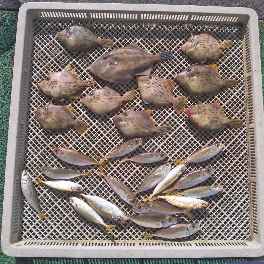 アジ25cm頭に180尾、チヌ38cm頭に2尾、マダイ30cm頭に2尾、ヒラメ39cm、ウマヅラハギ36cm、サバ30cm頭に60尾。