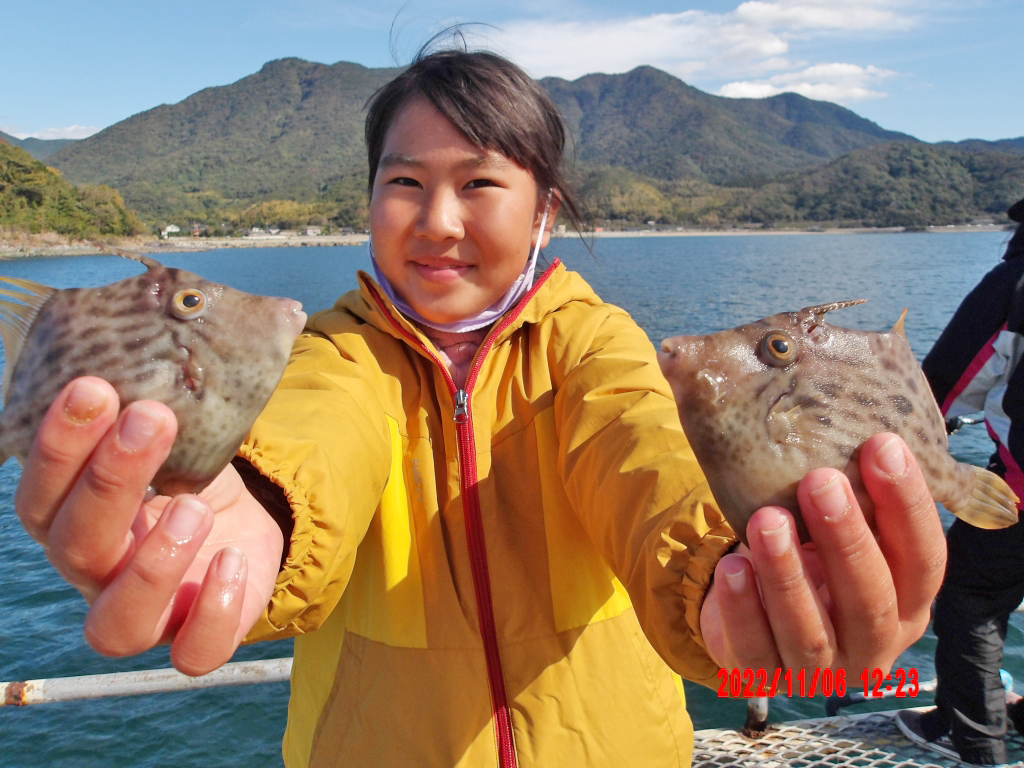 長浜周辺でキス23cm頭に22尾、カワハギ24cm頭に9尾。