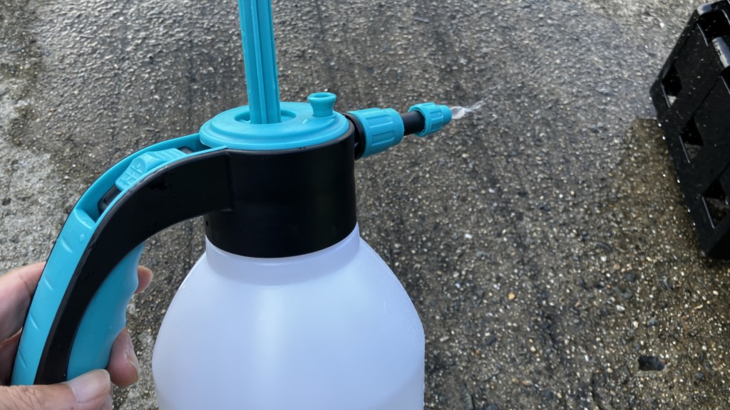 使い方は、以前使っていた商品と同じく、手動でポンピングを数回し、タンク内の水圧を上げて、ボタンを押して水を噴射するだけだ。