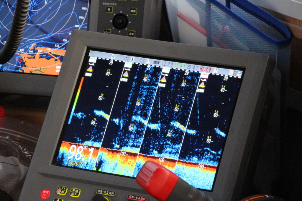 魚探の反応を見て船を立て、「底から10m辺りを中心に探ってください」のアナウンスで釣り開始となりました。まずは底から誘う釣り人たち。すぐに電動リールの巻き上げ音が鳴り響きましたが、釣れたのは幅指3本級。