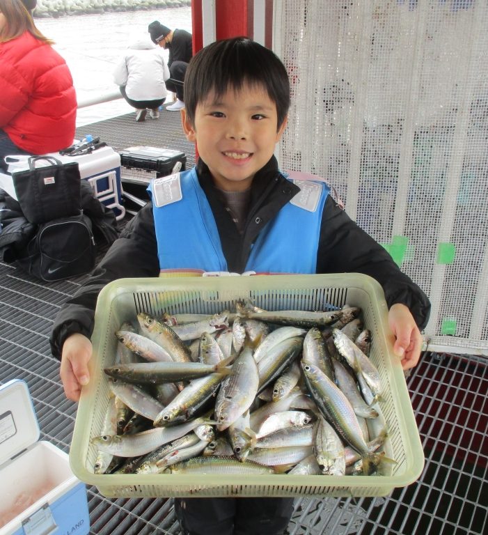 マイワシ15~23cm3500尾、カタボシイワシ16~23cm3300尾、ヒイラギ400尾、サバ17~28cm500尾、アジ80尾、コノシロ15~20cm130尾、サッパ12~15cm20尾、サワラ82cmと78cm、サゴシ56cm、メジロ61~78cm17尾、ヒラメ65cm。