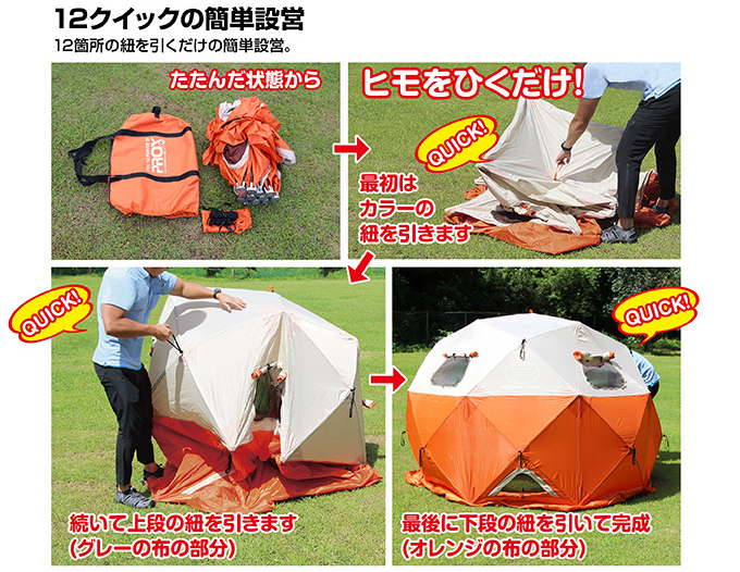 そんな大型のテントですが、プロックスから登場した「クイックドームテント パオグラン」は、設営がとっても簡単!! テント設営のビギナーにもオススメできる8角形のドーム型テントです。