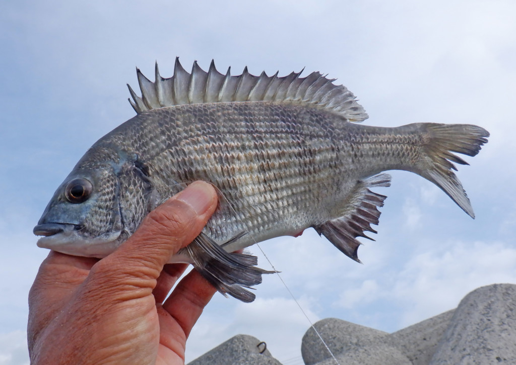 釣り始めて約2時間後の13時頃、やっとグレがきた。22cmほどだが、グレは引きが強いので面白い。
