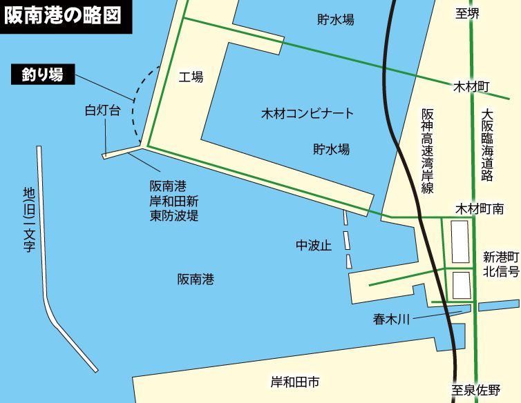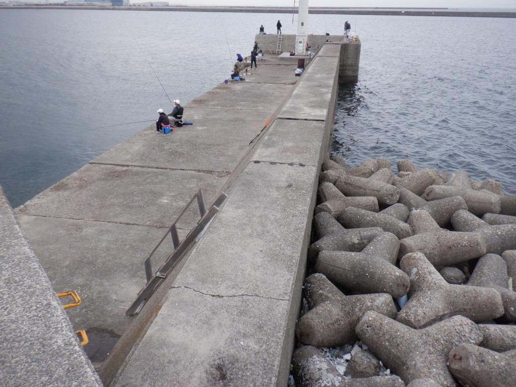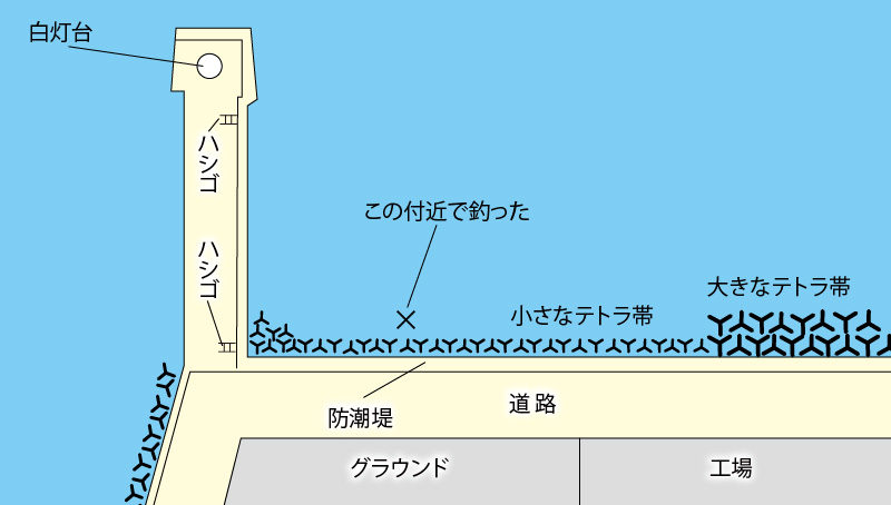 白灯波止の付け根から北へ伸びるテトラ帯は、ホクシン(右側にある工場)前にかけて400mほどあるが、中ほどでテトラが大きくなって危険なので、そこまでの間が釣り場。