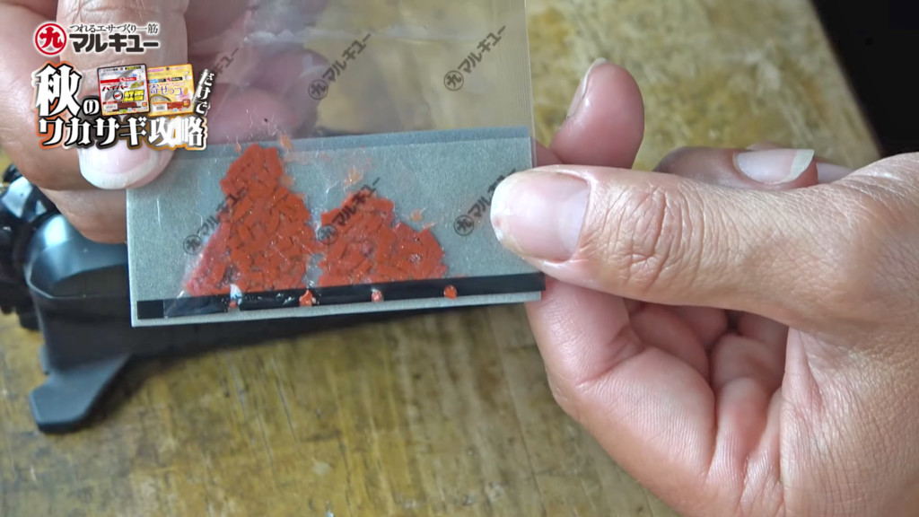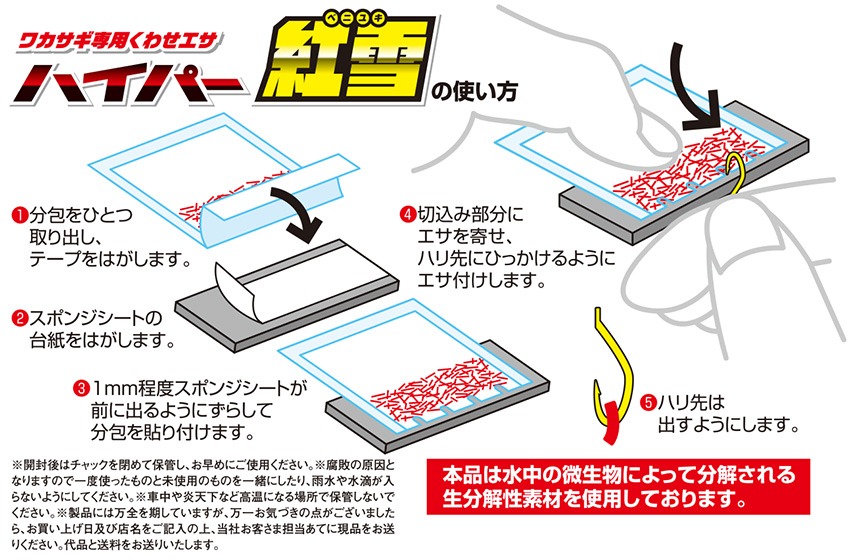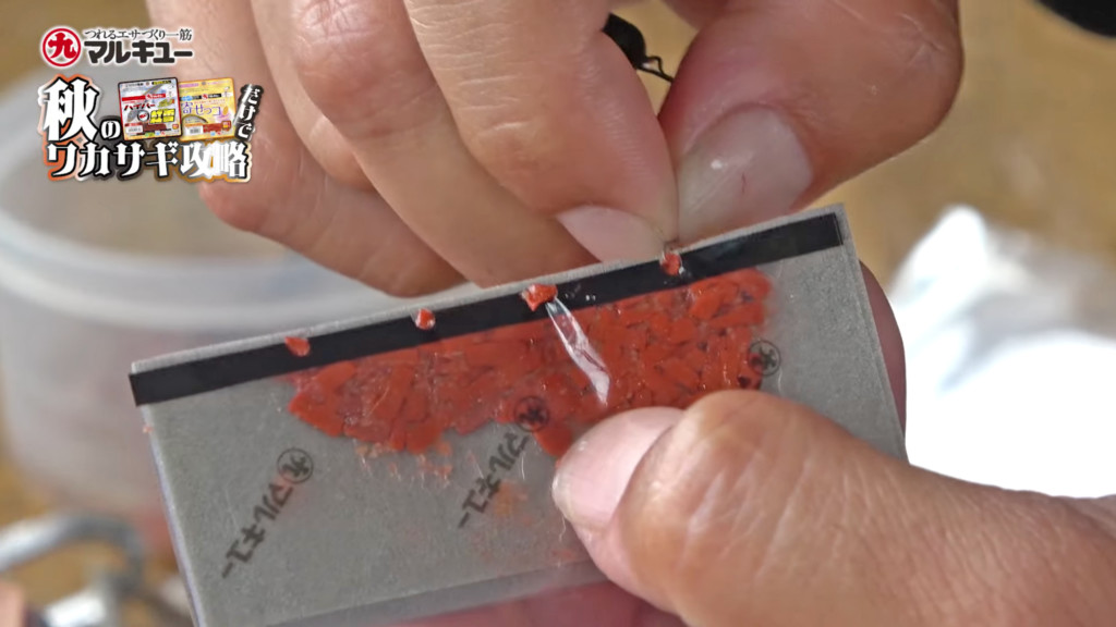 「ハイパー紅雪」の使い方はズバリ、サシエです。そのまま針に付けて落とすだけ。めちゃくちゃ簡単ですし、袋から出さずにつけられるようになっているので手も汚れません。