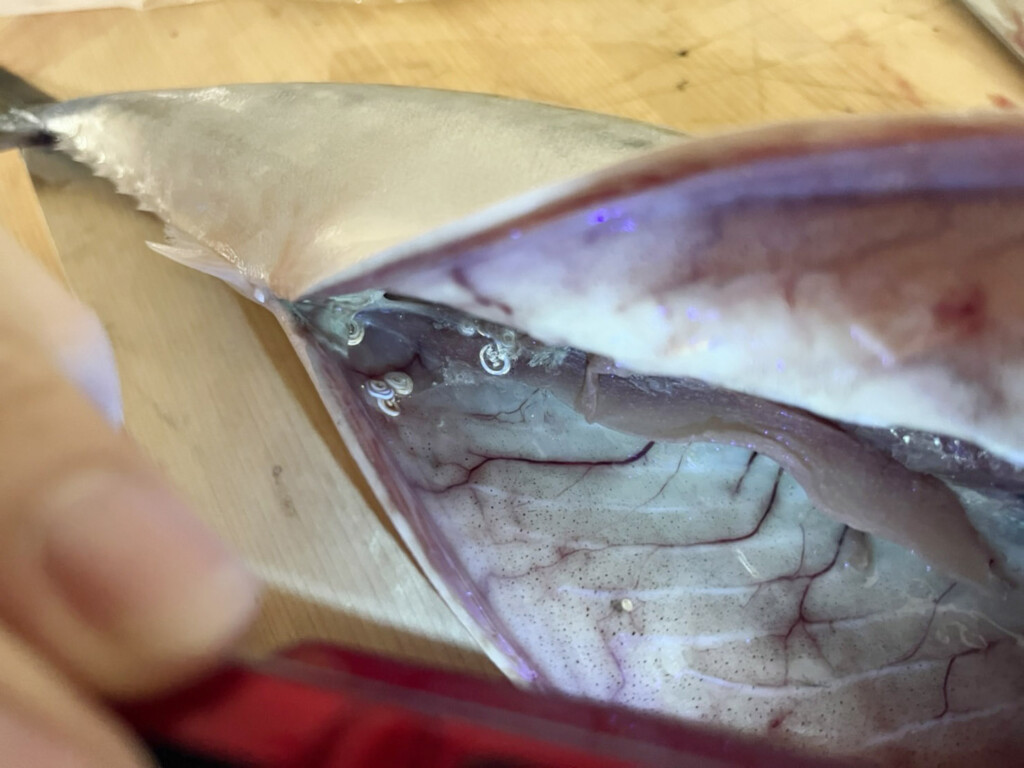 内蔵に寄生していることの多いアニサキスですが、鮮度によっては身の方に寄生しているコトも。