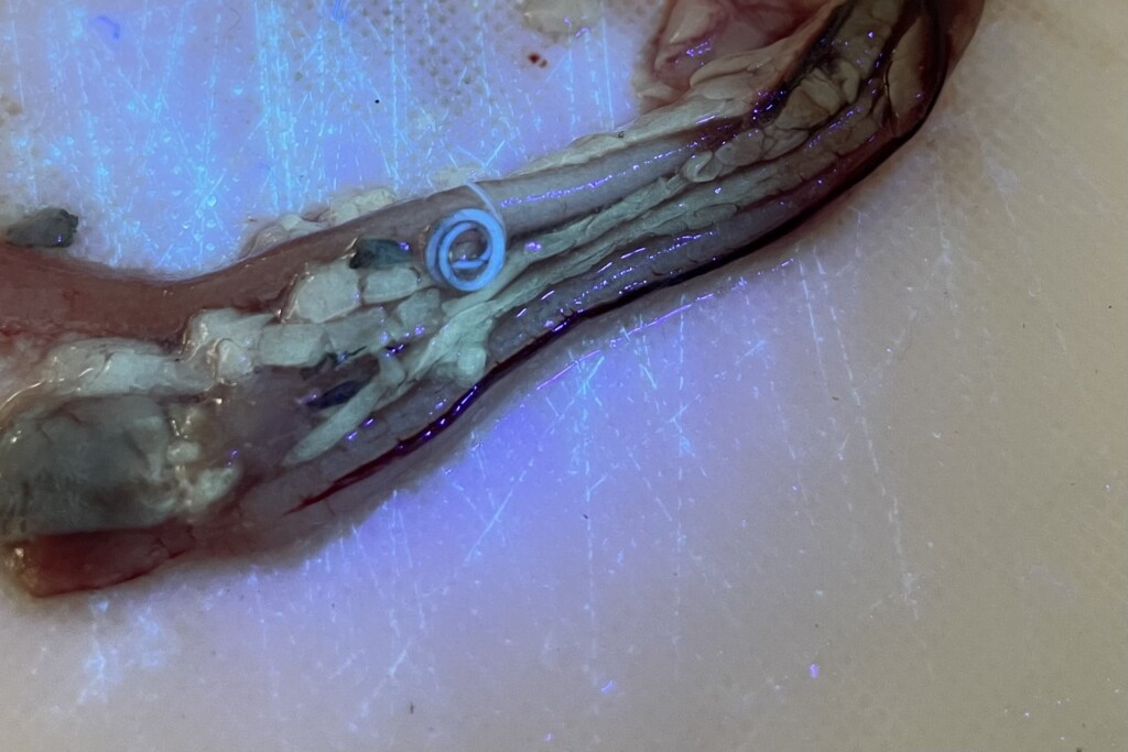 どうでしょう! ハッキリと青白く浮かび上がっているのが分かると思います。そう、このくるっと丸まっているのがアニサキスです。