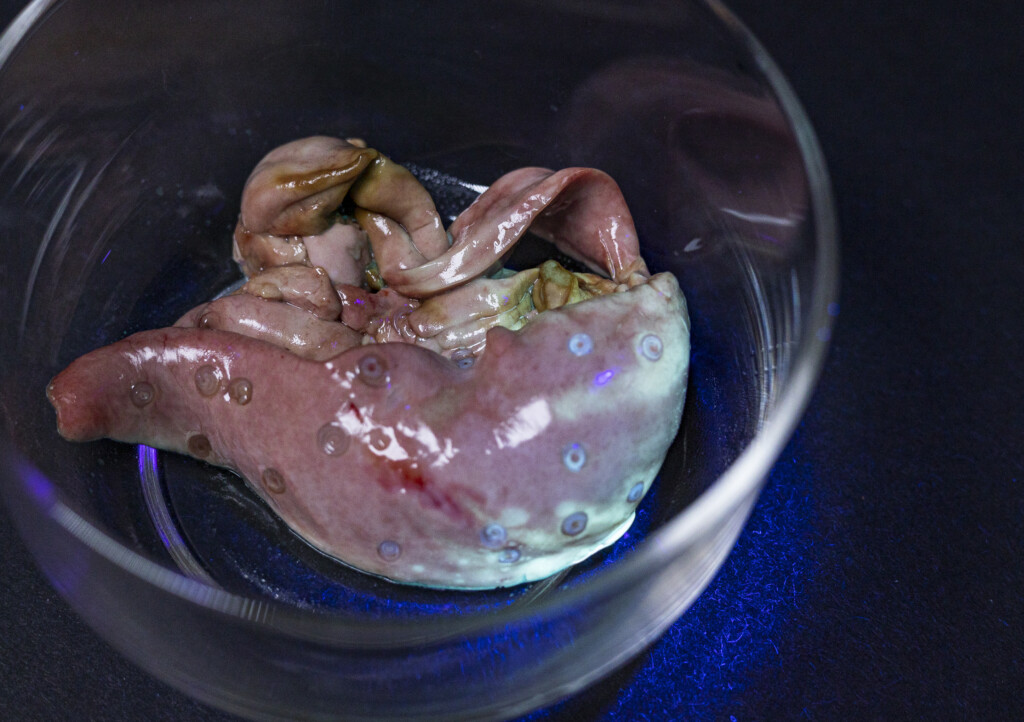 まずは、照射前のアニサキスが寄生しているサバの内臓の画像から。