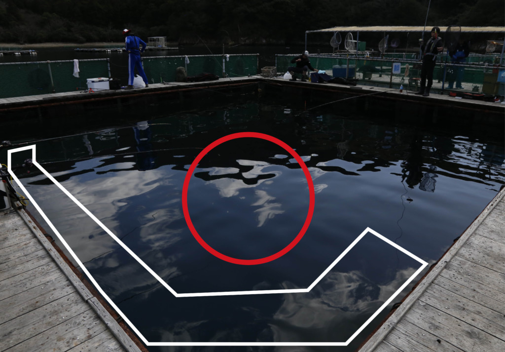 白で囲んだイケスの端や角付近がマダイのポイント。アカで囲んだイケス中央付近が青物狙いのポイント