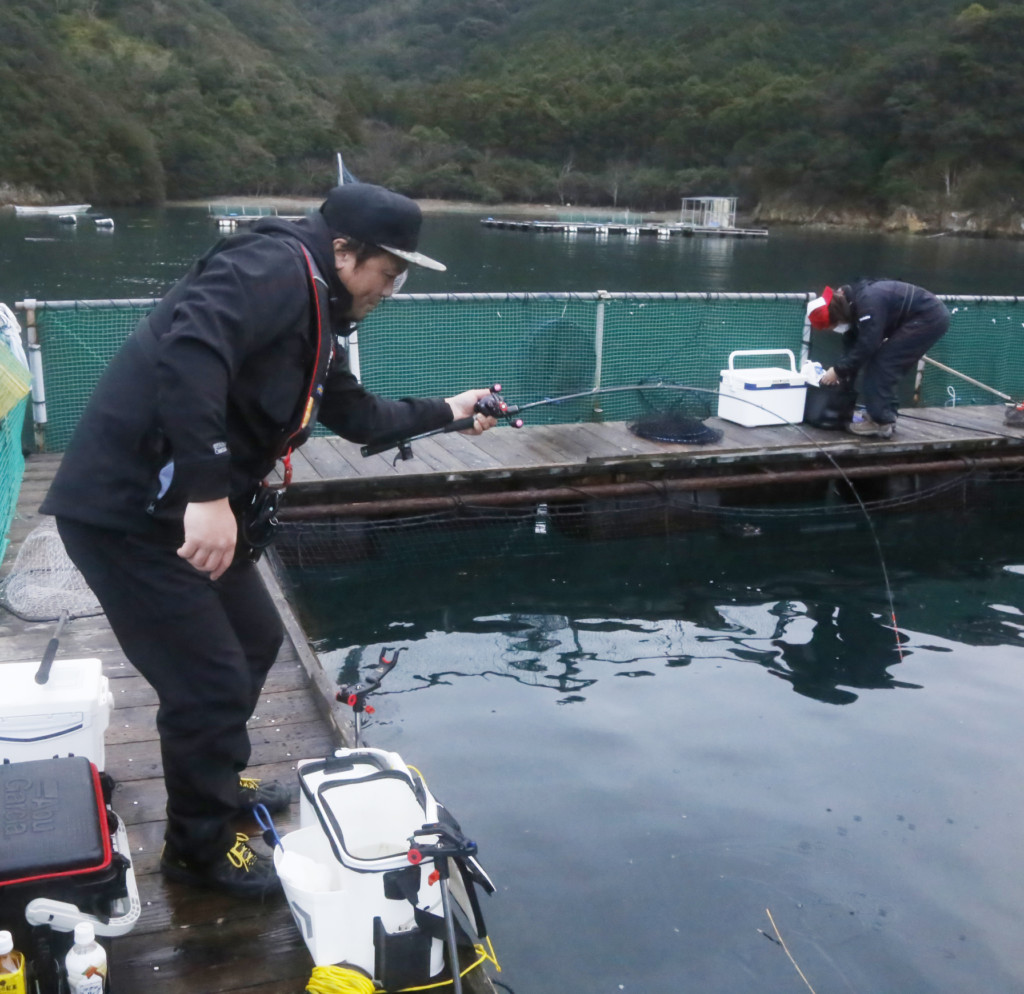 青物狙いはイケス中央で放流直後は生きエサで、活性が下がれば切り身エサで狙う。