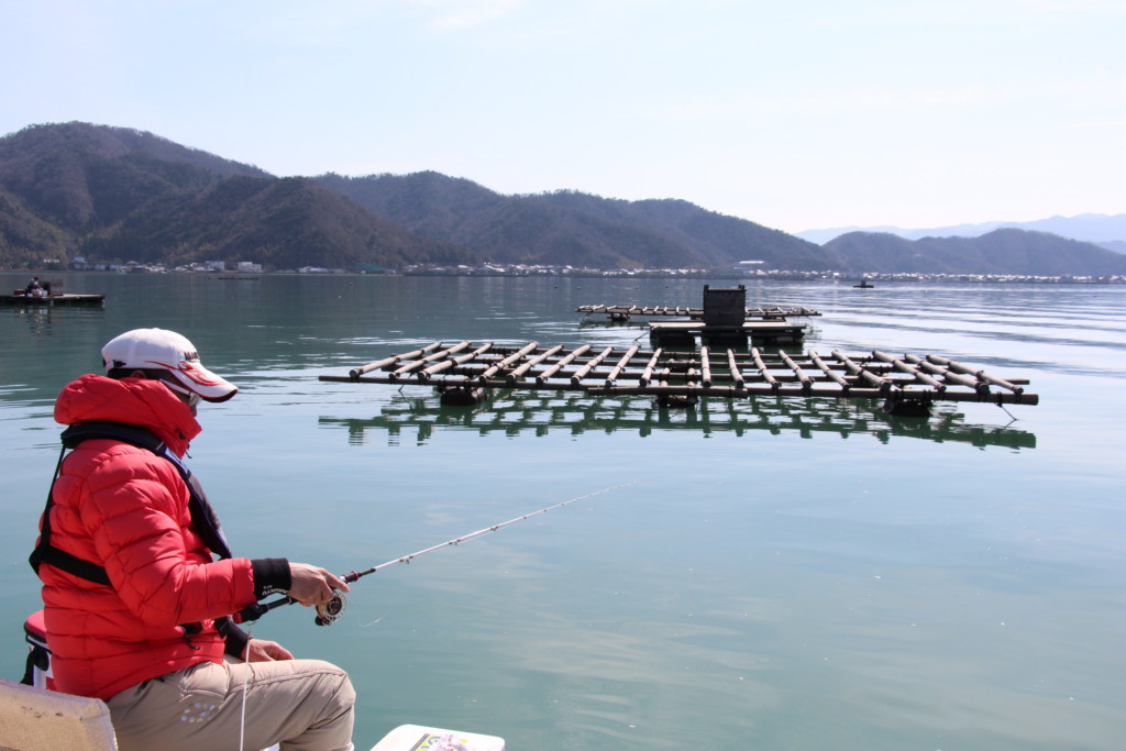 仏谷の筏は小型で、風や潮に押されて動くので、釣りの最中にも周囲のカキ棚との間隔や向きがかわる。