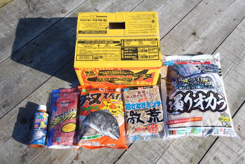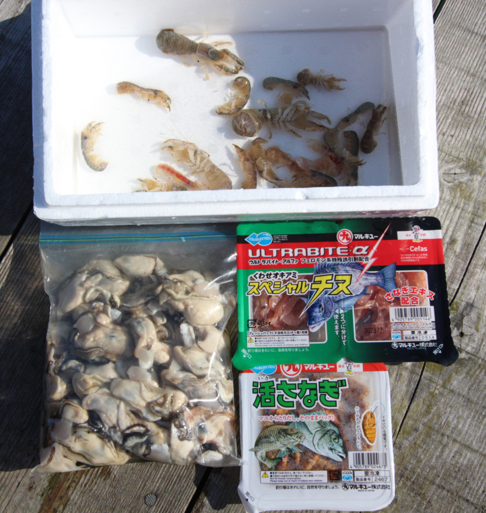 藪氏が用意したエサは、写真の通り、カキのムキ身、ボケ、カメジャコ、オキアミ、サナギ。