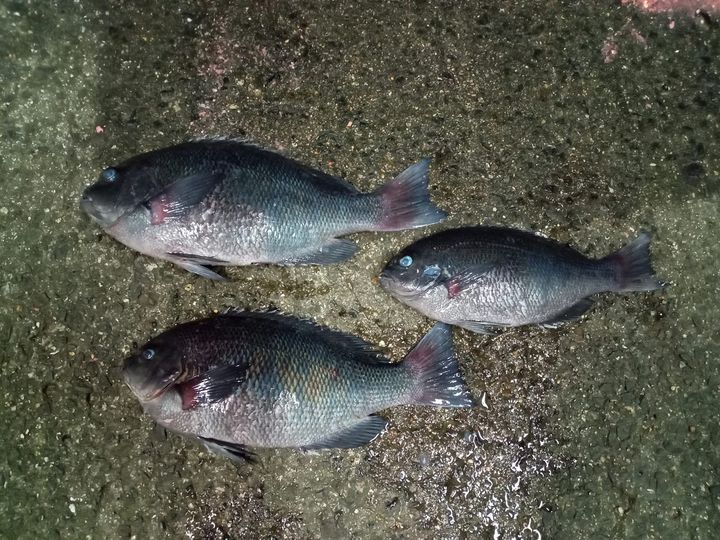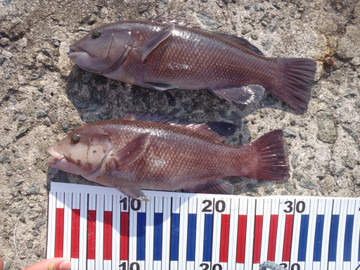 灘浜近辺でガシラ20cm頭に5尾、チヌ45cm頭に2尾、メバル24cm頭に10尾。